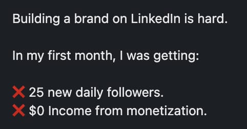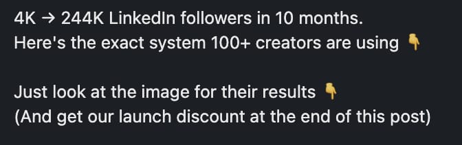 Show, don't just tell. Here’s an effective one by my friend Chris Donnelly. The visual is super important because you hook people with your text hook AND the visual.