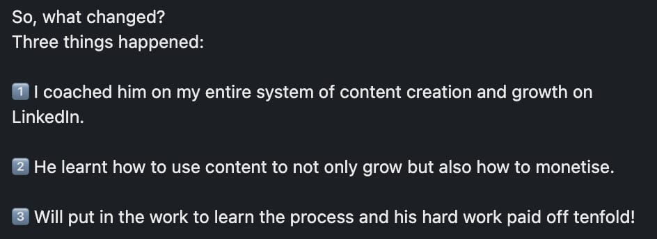 I am a [type of business] selling to [ideal customer]. I want to write a transformation LinkedIn case study. Please use this framework and include the details.