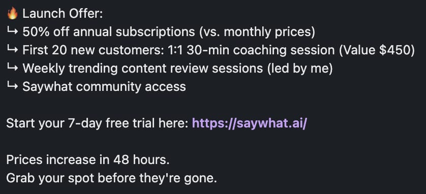 Clear Call to Action - Guide interested readers to [your call to action like a free trial or send you a DM]. Include urgency and authentic scarcity