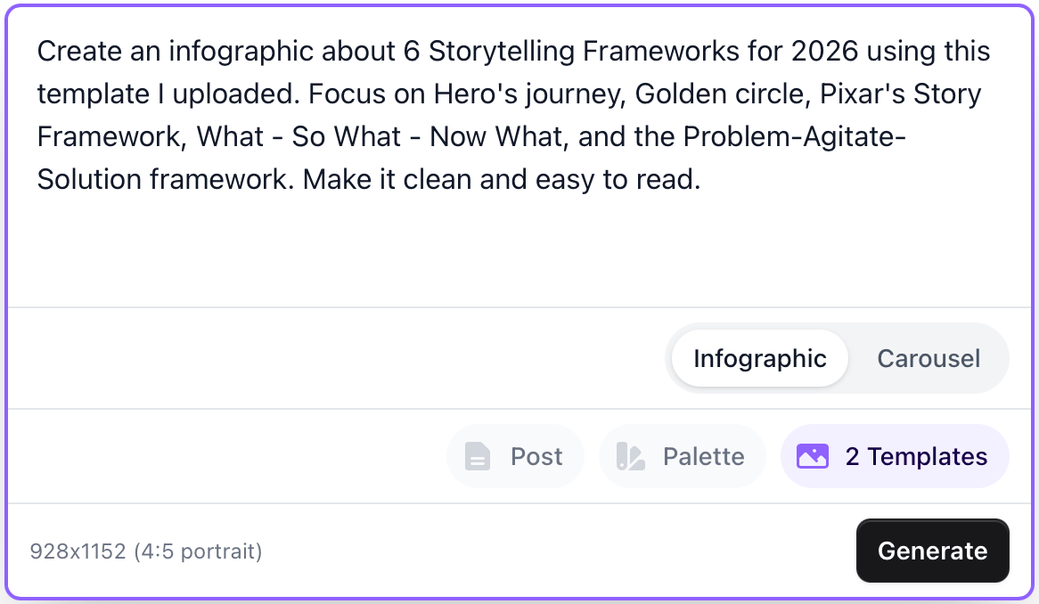 "Create an infographic about [your topic] using this template I uploaded. Focus on [specific angle or key points you want to highlight]. Make it clean and easy to read."